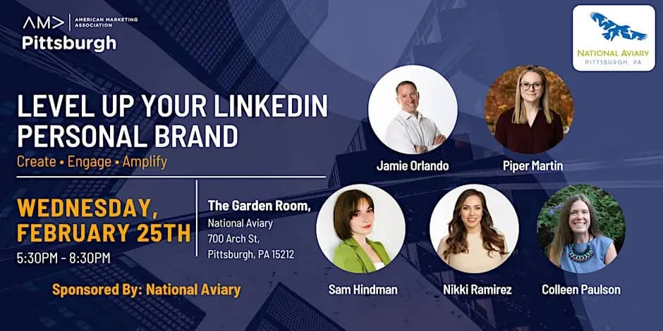 Speaking of events, I'll be a panelist at the American Marketing Association - AMA Pittsburgh's upcoming "Level Up Your LinkedIn Personal Brand" discussion - we'll be at the National Aviary on Wed, Feb 25, from 5:30 PM - 8:30 PM.